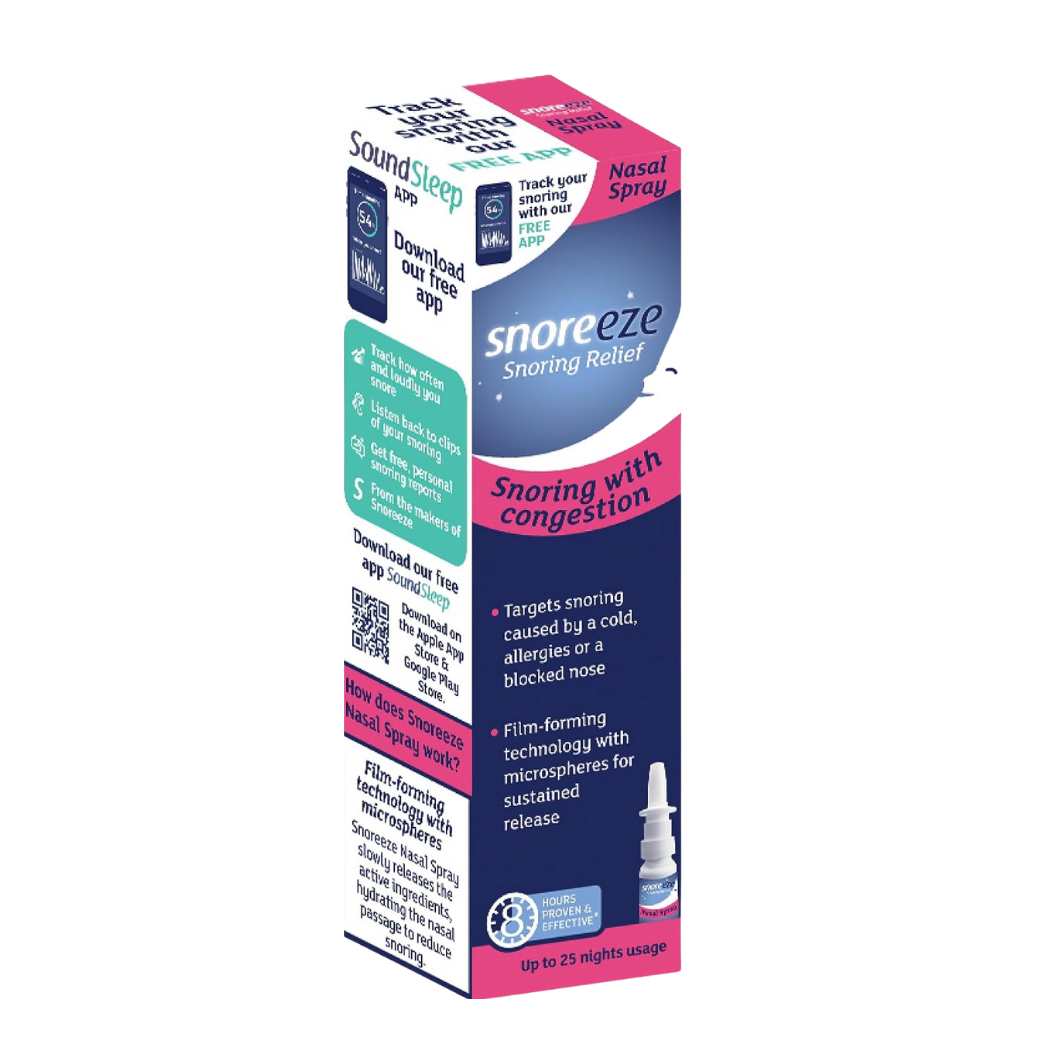 Breathe easier with Snoreeze Nasal Spray. This anti-snoring spray targets snoring caused by a cold, allergies, or a blocked nose. A unique blend of natural active ingredients opens the airways to provide effective snoring relief for up to 8 hours.